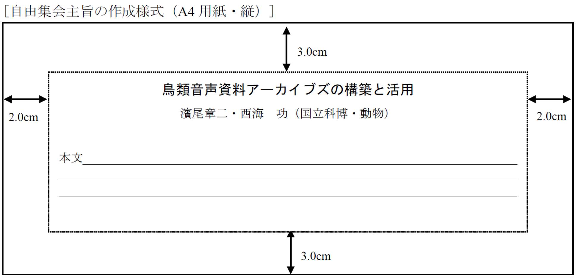 開催主旨は,集会の目的と内容を簡潔にまとめ,以下の様式にならってA4サイズ1枚(PDFファイルもしくはワードファイル)で作成して下さい.
